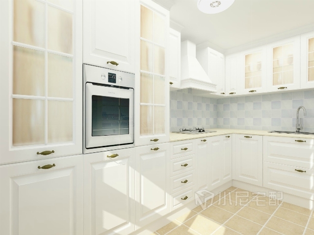 白色的櫥柜組合,藍白格子的墻磚,清新整潔,功能強大。