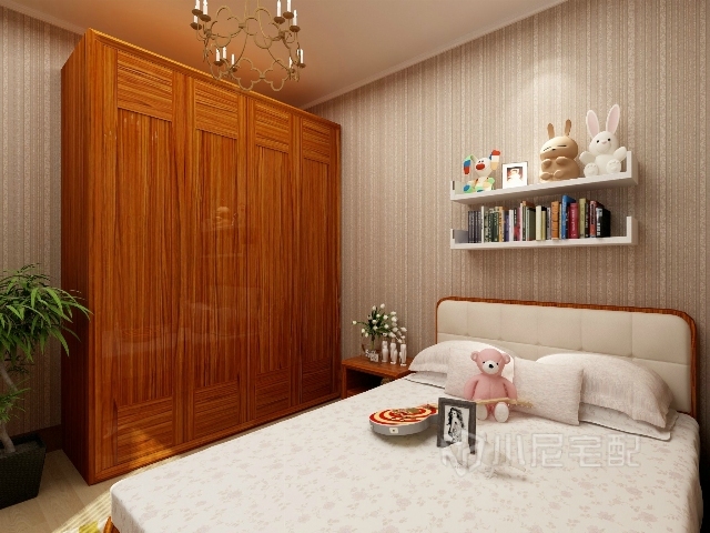 兒童房床頭的壁架適合孩子放一些睡前讀物,玩偶,墻貼增加了兒童房的童趣。