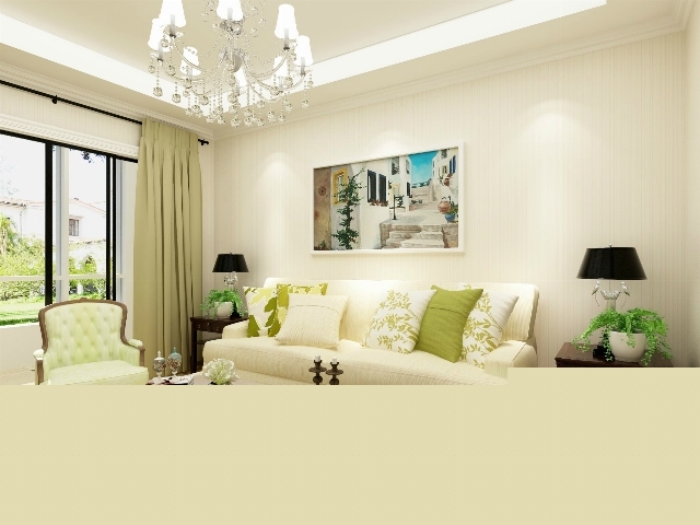 綠色的沙發(fā)抱枕和窗簾相呼應(yīng),白色的布藝沙發(fā)黑色的邊幾,舒適又時(shí)尚。