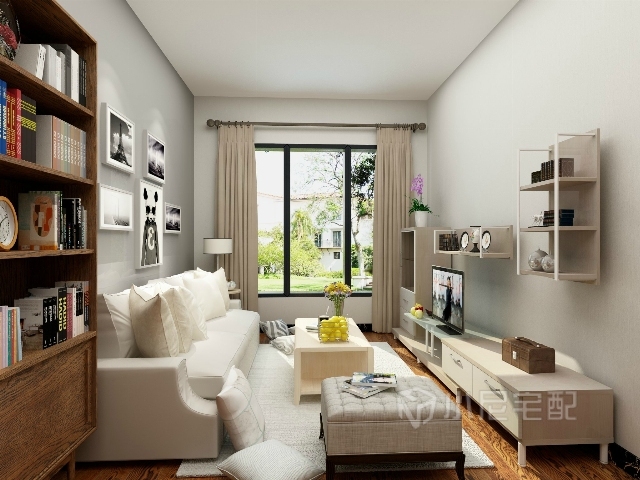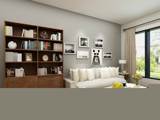 深色實(shí)木大書架,白色簡約沙發(fā),個性的照片墻,體現(xiàn)知性的文藝氣息。