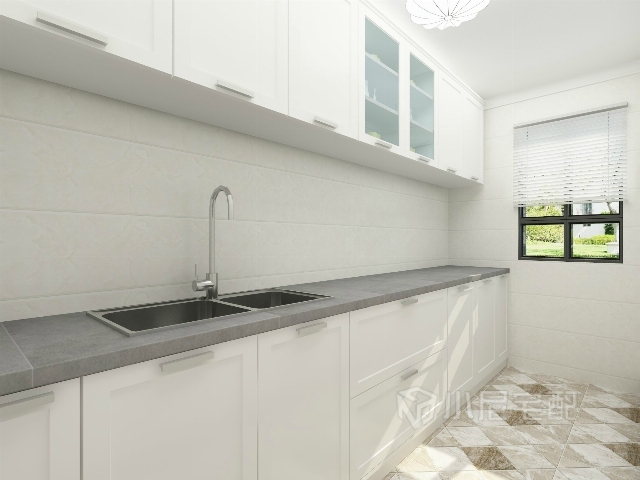 白色的櫥柜,花地磚,顯得干凈寬敞明亮。