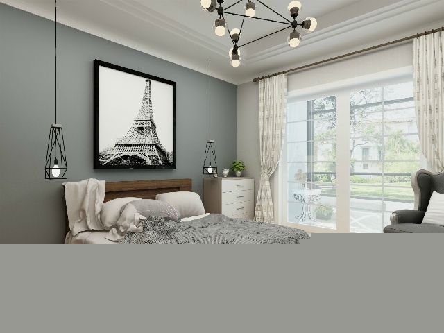 臥室選用低矮的床,灰色的墻面,現(xiàn)代的吊燈,時尚又個性。