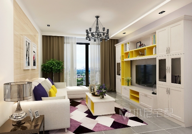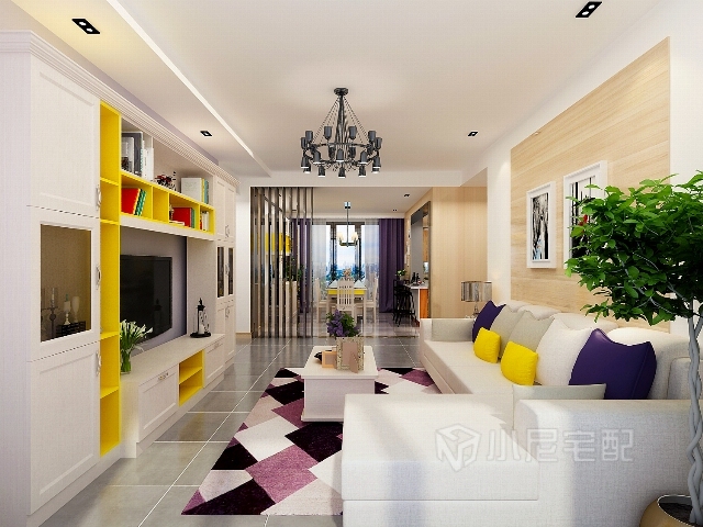 利用黃色和紫色為互補色,用紫色的抱枕和地毯做為點綴,活潑而不失優雅。