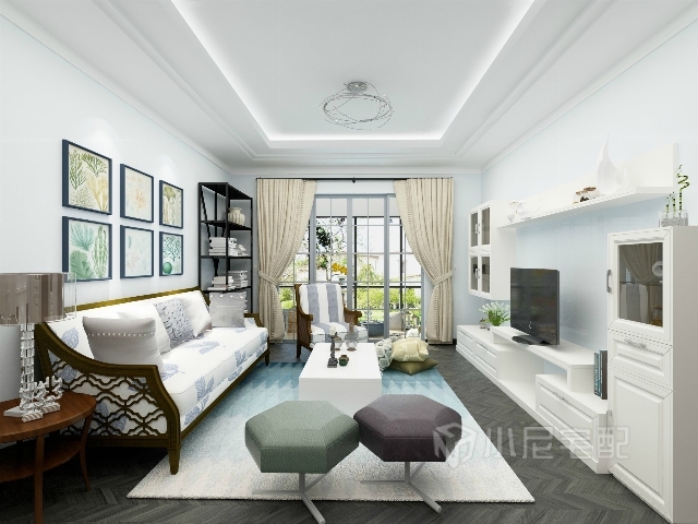 整體以淡藍色為基調,顯得通澈又靜謐,兩個彩色的小皮凳又增加了幾分俏皮的感覺。