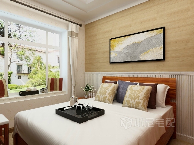 木飾面的背景墻搭配簡約的裝飾畫,顯得溫馨舒適,十分柔和。