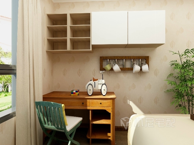 復古的書桌椅,簡潔造型的吊柜,打造一個工作學習的舒適的小空間。