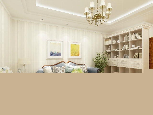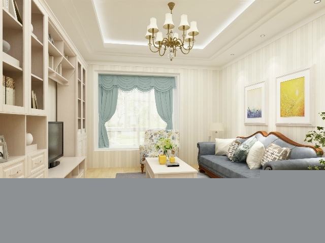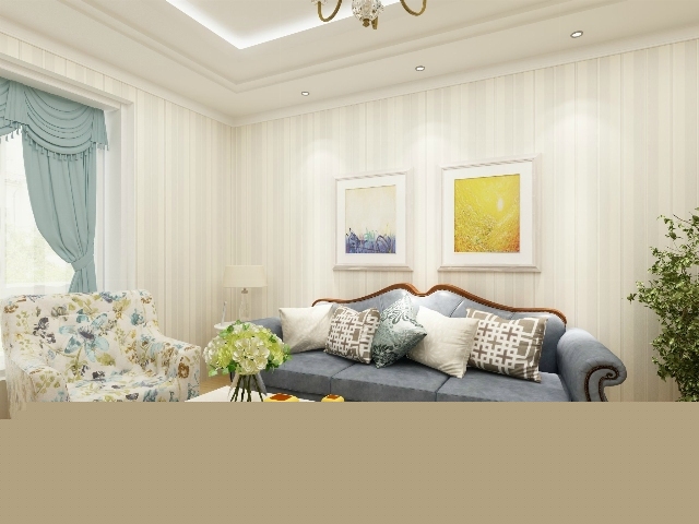 歐式布藝沙發(fā),色彩鮮艷的裝飾畫,基本配色為藍(lán)色和黃色,顯得十分和諧。