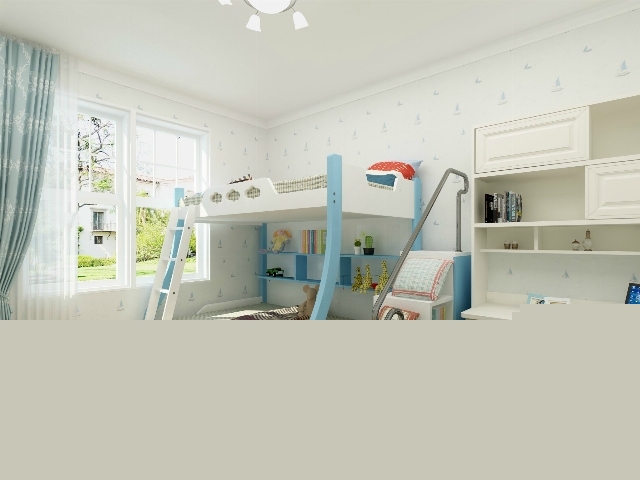 藍色的高低兒童床,轉角書桌,適合活潑好動的孩子。