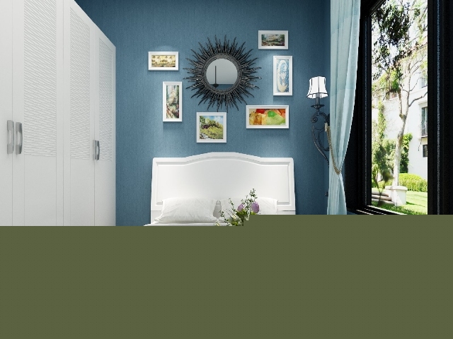 從窗戶看進來,湖藍色的墻面背景很有美式的特色
