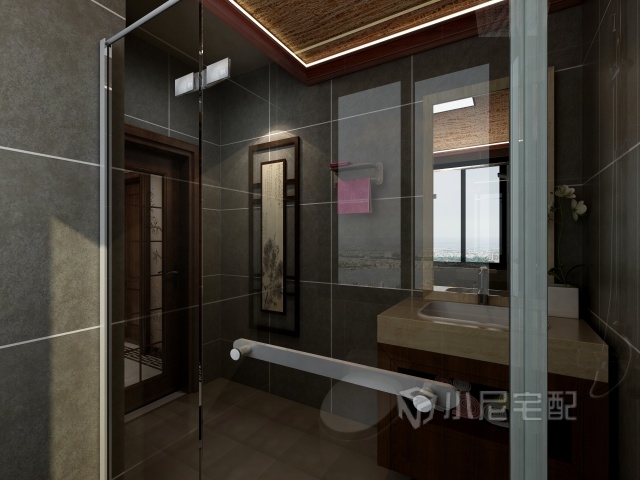 衛生間搭建了玻璃浴房起到干濕分離的左右,獨特的吊頂和掛畫點綴著中式的空間。