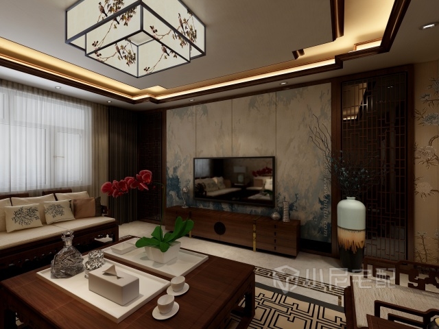 對稱是中式的特色設計,電視墻添加對稱的中式木格柵裝飾,搭配水墨畫,凸顯中式獨有的特色