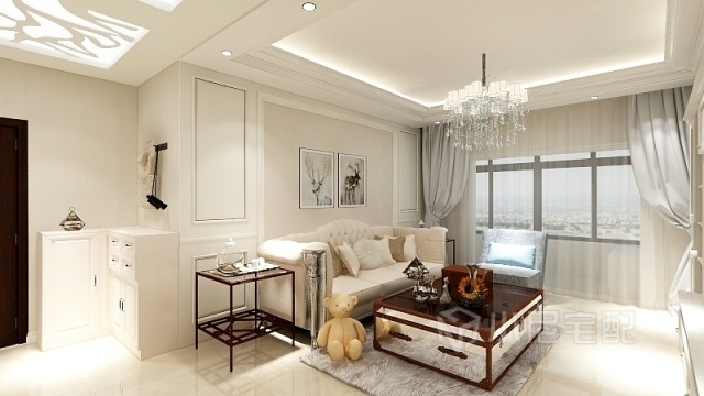 本次設計主要是簡歐風格,維度款珠光白顏色給人一種清新典雅的感覺,仿佛脫去了繁復,增加了幾分淡雅,搭配深色的茶幾,畫飾抱枕的點綴又增添了幾分家的味道。