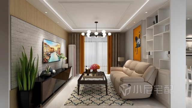 客廳的沙發是男主人的最愛,在此基礎上搭配木飾面板和文化石作為背景墻,整體簡約又不乏時尚。