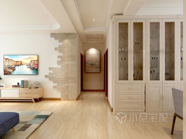 客廳背景墻選用的是實木貼皮,以不規(guī)整的造型增加趣味性,吊頂?shù)膱A弧造型與簡約風更加契合,加以自然光的照射給人強烈的色彩沖擊力