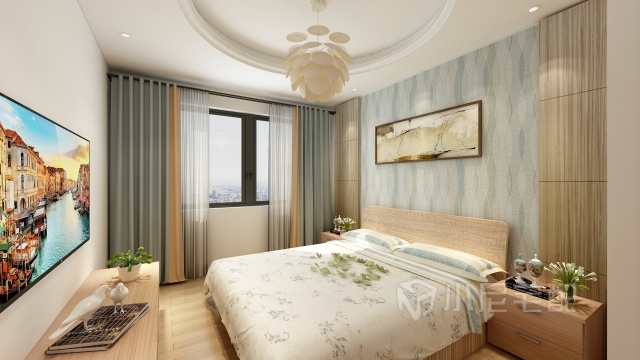 丹麥暖陽系列的床品與灰藍色窗簾的搭配冷暖相襯,層次分明