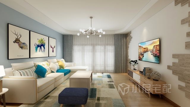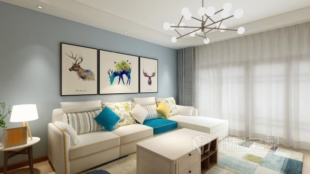 用小尼沙發(fā)色彩飽滿度較高的靠墊抱枕搭配以干凈明亮的茶幾以及淺孔雀藍的沙發(fā)背景墻,令整個客廳空間鮮亮。