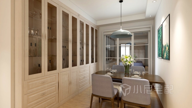 餐廳酒柜的設(shè)計是金絲胡桃的柜體 跟整個空間的顏色相協(xié)調(diào),餐廳掛畫的位置是點睛之筆