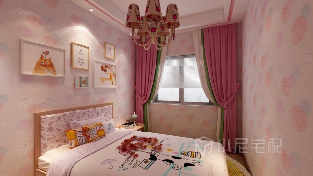 粉色公主房的設(shè)計采用的是丹麥暖陽系列,金絲胡桃的床頭使整個空間溫馨恬靜