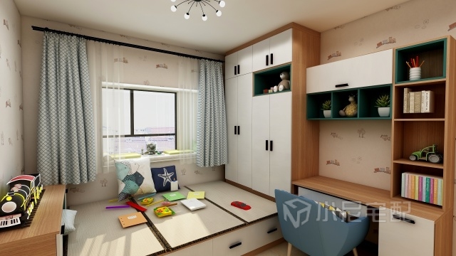 兒童房采用小尼宅配定制榻榻米方案,舒適的原木色柜體配上純白烤漆門板,加以藍(lán)綠色點(diǎn)綴,讓整個房間有了童趣感,配上簡單的書桌,滿足了小主人的所有需求。