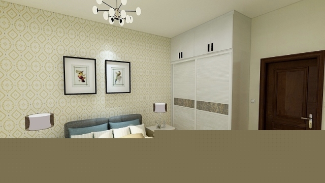 主臥室小尼宅配定制的衣柜給了主人很大的儲物空間,淡淡的藍(lán)色墻紙顯得整個房間舒適而透亮。
