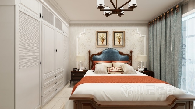 主臥按業(yè)主需求,衣柜采用不同門板造型,床頭背景墻采用弧形造型增加溫馨氣氛。