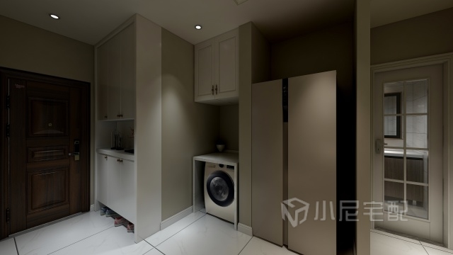 門廳放置洗衣機和冰箱,多出的空間加以合理利用。空間布局更簡潔
