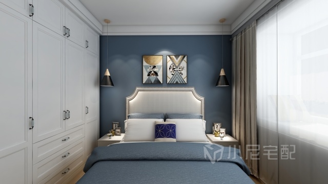 臥室采用藍色的背景墻,顏色的搭配上舒適又安逸。