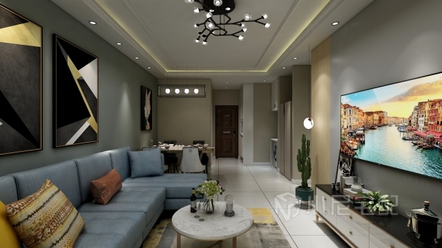 背景墻木地板配灰色墻漆加以裝飾,整體簡潔又不失時尚