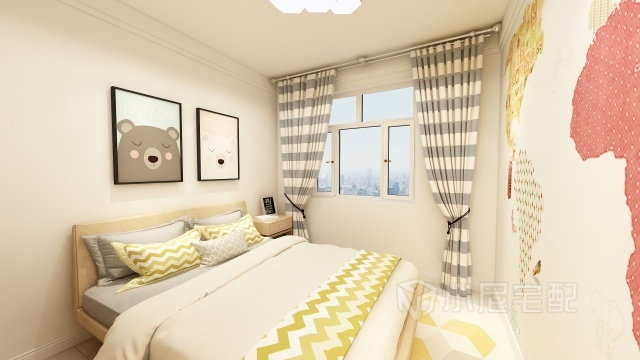 次臥墻面貼整幅彩色世界地圖壁紙,增加童趣