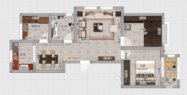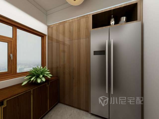 儲物間在廚房旁邊,因為廚房餐廳空間有限,冰箱安排在此,高柜用來放衣服矮柜用來放一些廚房用品,給主人留足儲物的地方。