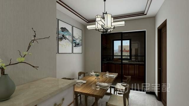 餐廳的吊頂簡單、吊燈復雜,一簡一繁搭配木紋餐桌,古樸中帶有現代,不會讓主人感覺壓抑。