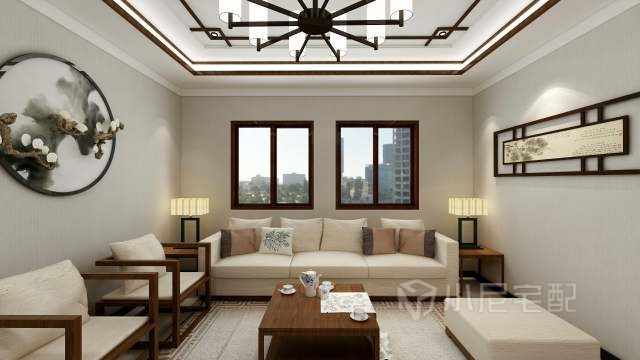 該戶型沒有玄關,一進門正對沙發和窗戶,整個客廳敞亮大氣,極有設計感的吊頂和舒適的布藝沙發,一點一滴都是中式之美。