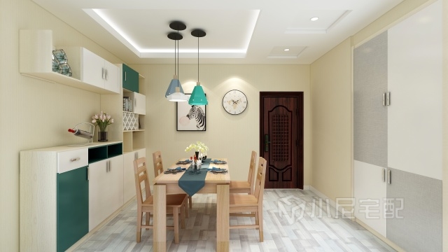 藍(lán)色吊燈與原木餐桌遙相呼應(yīng),配合深灰藍(lán)酒柜營(yíng)造出一種清爽風(fēng)