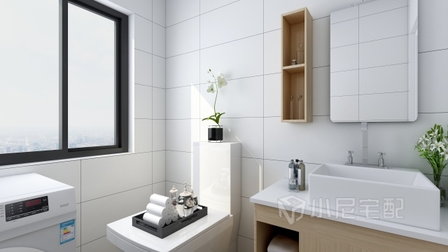 衛(wèi)生間原木色手盆及白色墻磚與主題北歐風(fēng)格相協(xié)調(diào)