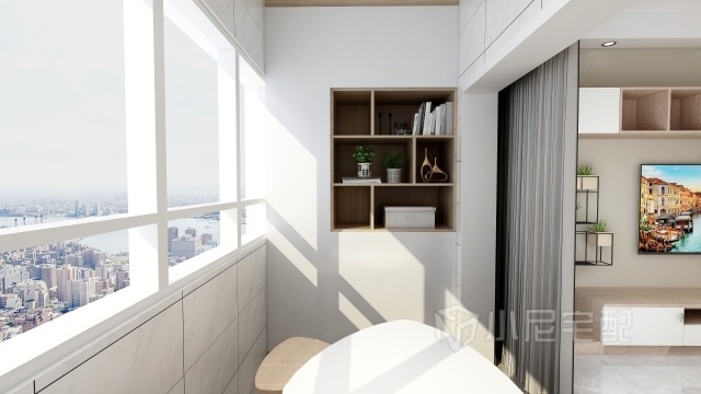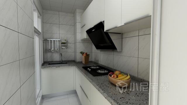 廚房采光一般,用大膽的鏡面門板搭配灰色臺面,提升整體的亮度和層次感