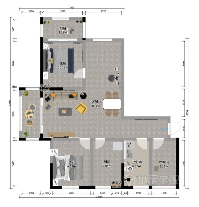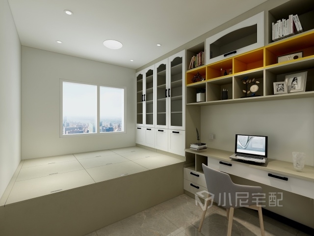 餐廳位置較小,餐邊柜設計為最簡單的吊柜,檸檬黃與書柜、客廳相呼應