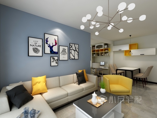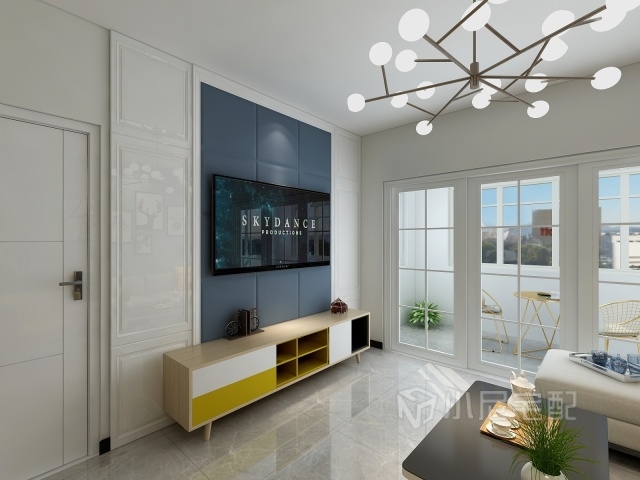 電視背景墻的藍與電視柜的黃搭配,百看不厭