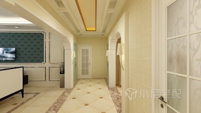 仿古鋪貼地面,深色仿古磚貼腳,暖色壁紙,搭配軟包背景墻,讓您舒適的同時(shí),用眼前一亮。