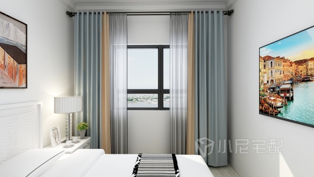 次臥淡藍色窗簾配合白色精品床飾,一切都以簡潔為主