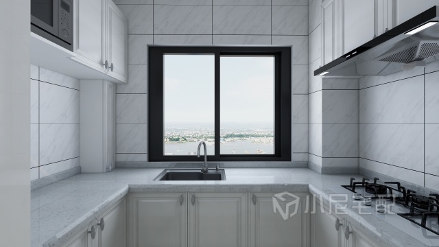 客廳定制白色簡歐電視柜,配合藍色背景墻與藍白相間窗簾創造出一種清晰自然的感覺