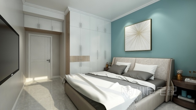 主臥的設計中體現了主人穩重內斂的氣質,木色與白色的柜門,在藍色的墻面的襯托下顯得更加有質感。簡約的掛畫在藍色的墻面上顯現溫馨舒適感覺。