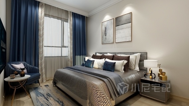 主臥室的設計中的簡潔得以特意極致體現,功能性滿足同時,在色彩搭配上給了藏藍色點綴的空間。