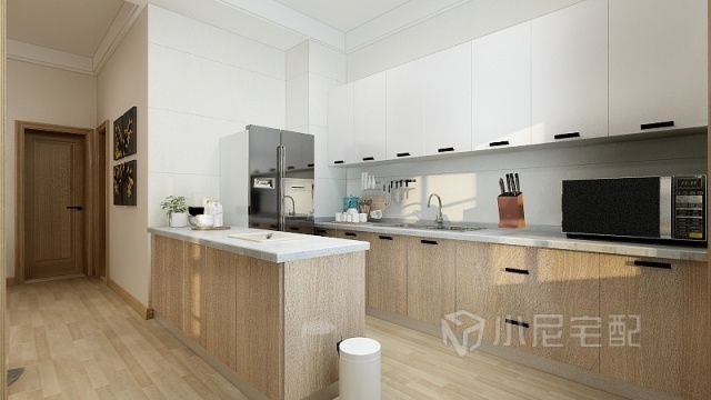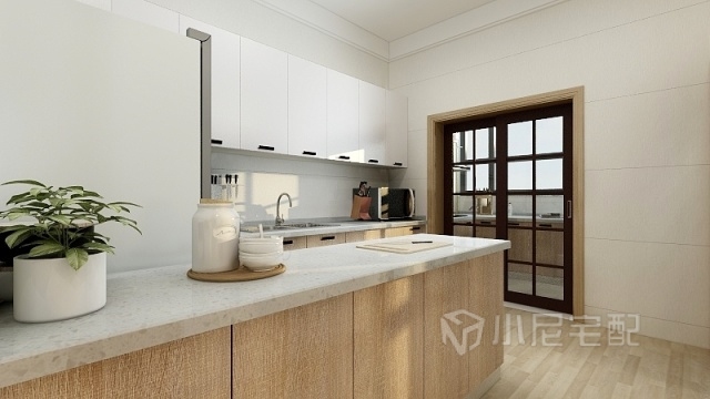 廚房的設計選材和色彩搭配上,注重實用美觀與顏值并存法。柜門造型顏色及灰色臺面的搭配出經典,精致細節體現到每個五金配件,用心生活也要懂得享受方寸間。