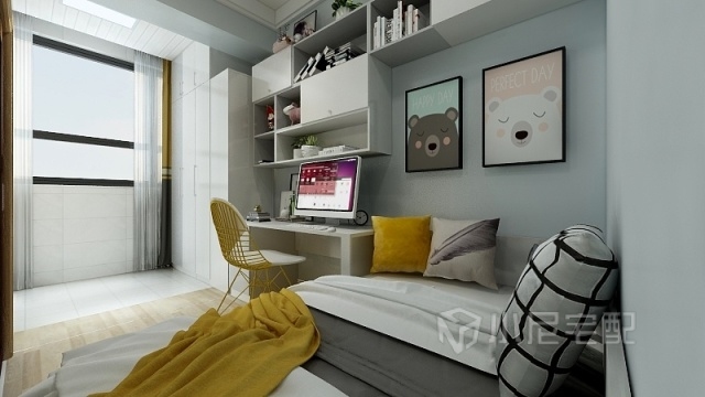 在小孩房的設計中以孩子活動空間為主的同時保證了睡眠的需求。淺綠色的墻面和檸檬黃色的搭配給了孩子夢想的空間,也給孩子活潑好動的自由空間。
