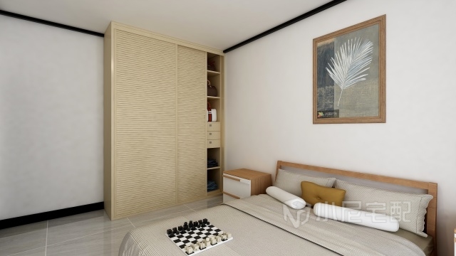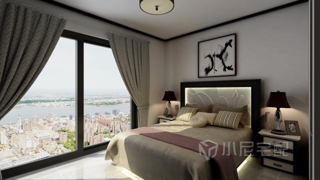 主臥整體顏色為黑白色,模仿徽派建筑的感覺(jué),新中式的實(shí)木床,穩(wěn)重大氣