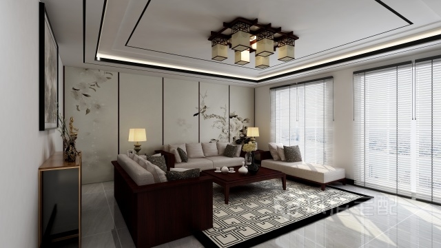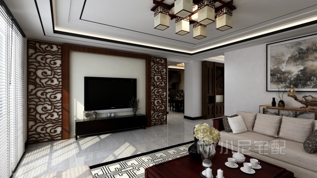 沙發(fā)背景以畫(huà)為墻,窗簾用卷簾,可以從視覺(jué)上增加客廳的面積。實(shí)木軟靠沙發(fā)更顯檔次
