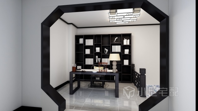 二樓樓梯口處是主人書(shū)房位置,為增加設(shè)計(jì)感,將過(guò)道門洞加寬,造型改為八角窗,顏色采用黑白搭配,有徽派建筑的影子