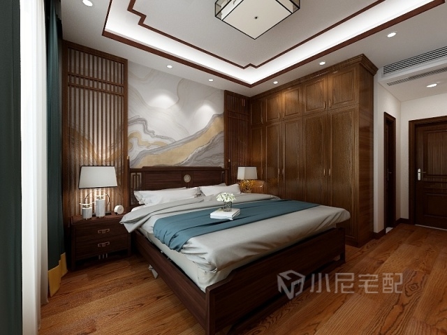 主臥室的背景墻用木質(zhì)的花格搭配抽象圖案的壁畫,讓空間具有了視覺焦點(diǎn)。