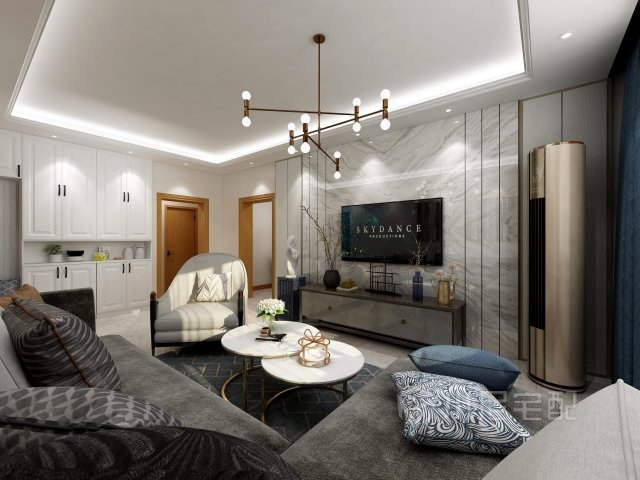 客廳的電視墻使用石材與硬包裝飾,再增加豎線條的點綴,從質感到造型都使空間豐富又不失內涵。