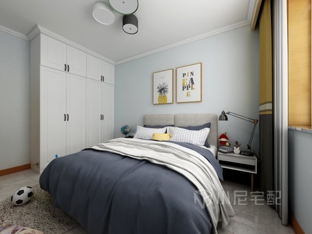 藍灰色的墻面給人感覺清爽舒適,姜黃色的窗簾更加增添了活躍的氣氛